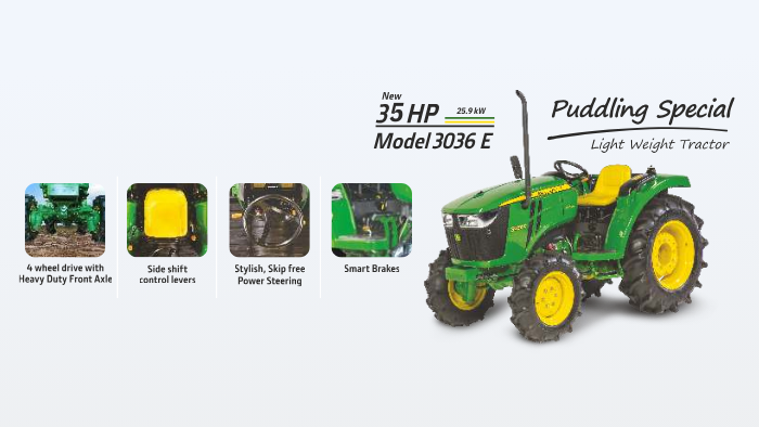 John Deere 3036E is a light weight 36 HP Puddling Special tractor. It is equipped with advance technology and a powerful engine which delivers exceptional performance and power in tough and rugged paddy/rice field applications.